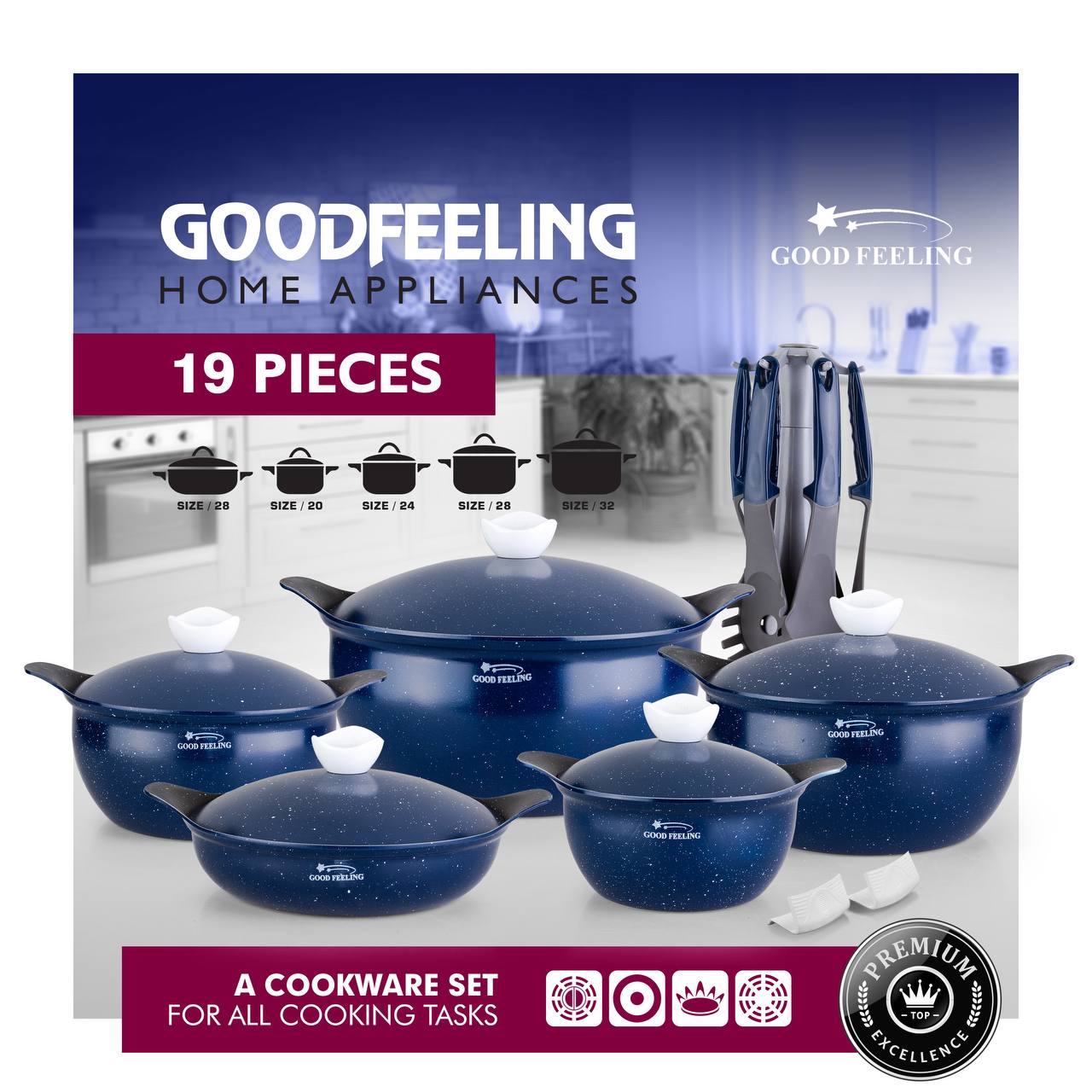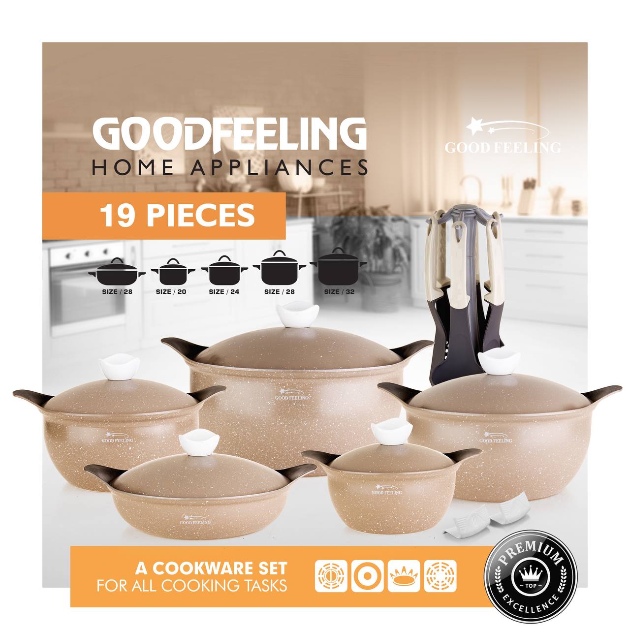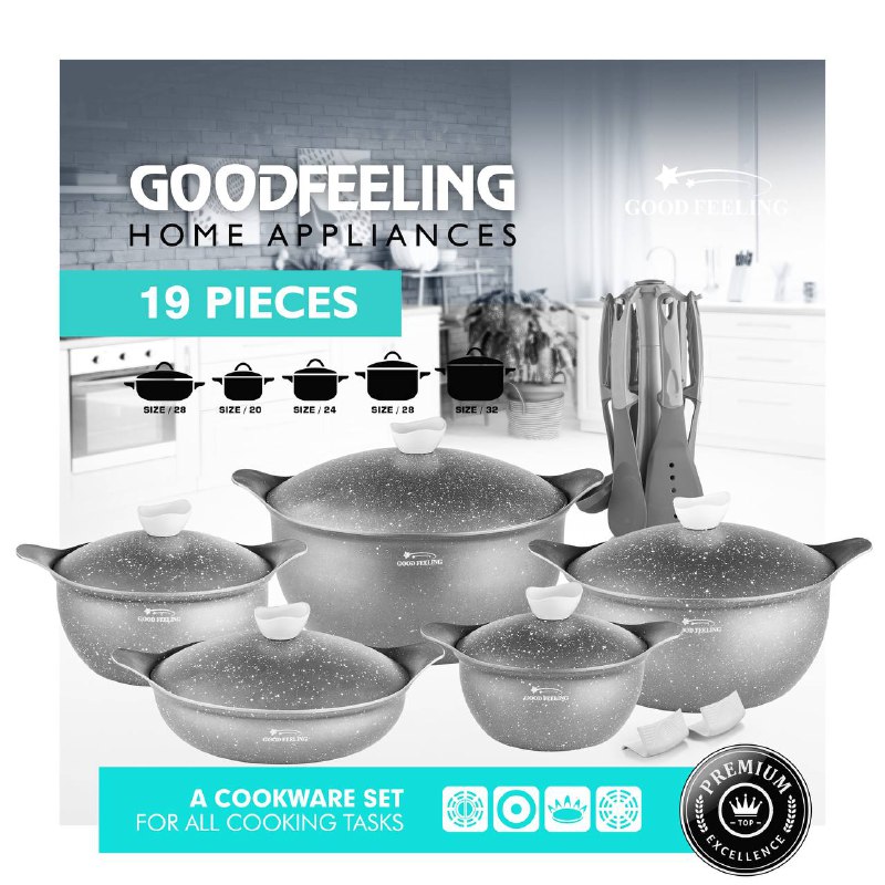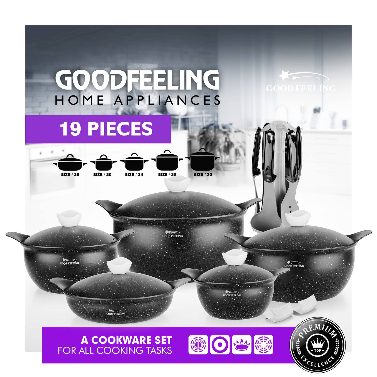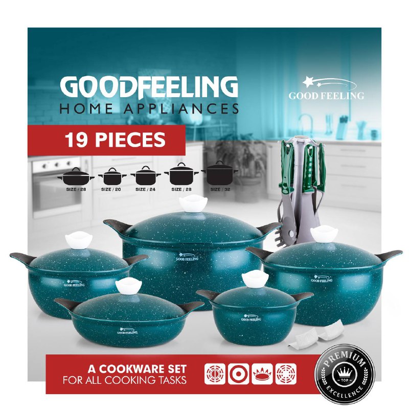 شامل قابلمه۳۲ قابلمه ۲۸ تابه ۲۸ قابلمه ۲۴قابلمه ۲۰همراه با سرویس کفگیر و ملاقه و ۲ عدد دستگیره نسوز سلیکونی